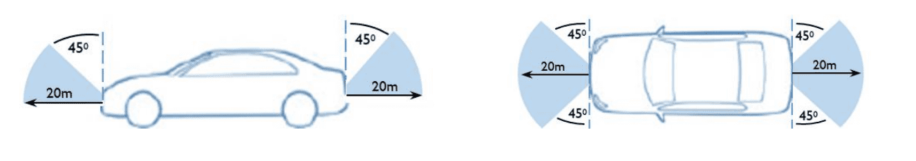 The rear number plate on the vehicle must be clearly visible from a distance of 20m within any point 45 degrees to the left, right or above the number plate as shown in the diagrams below