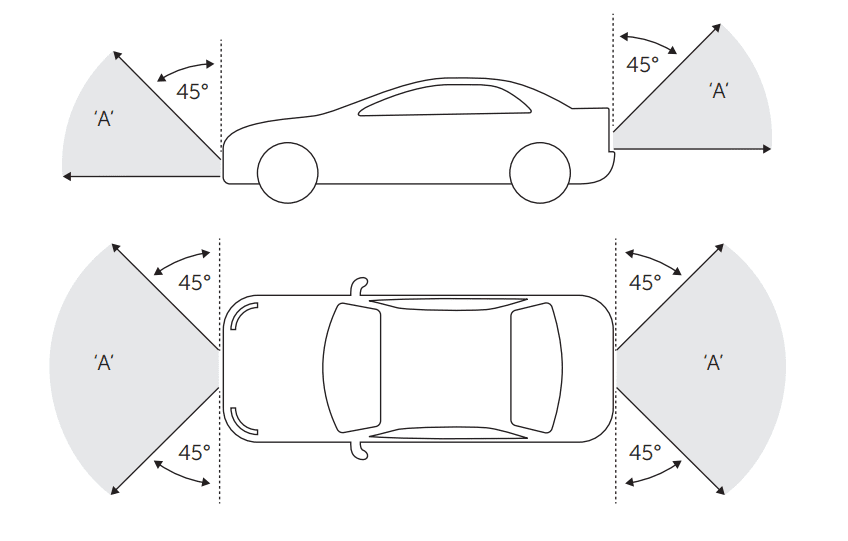 The rear number plate on a vehicle must be clearly visible from a distance of 20m from the number plate at any point within a 90-degree horizontal arc and a vertical arc of 45 degrees as shown in the diagram below.