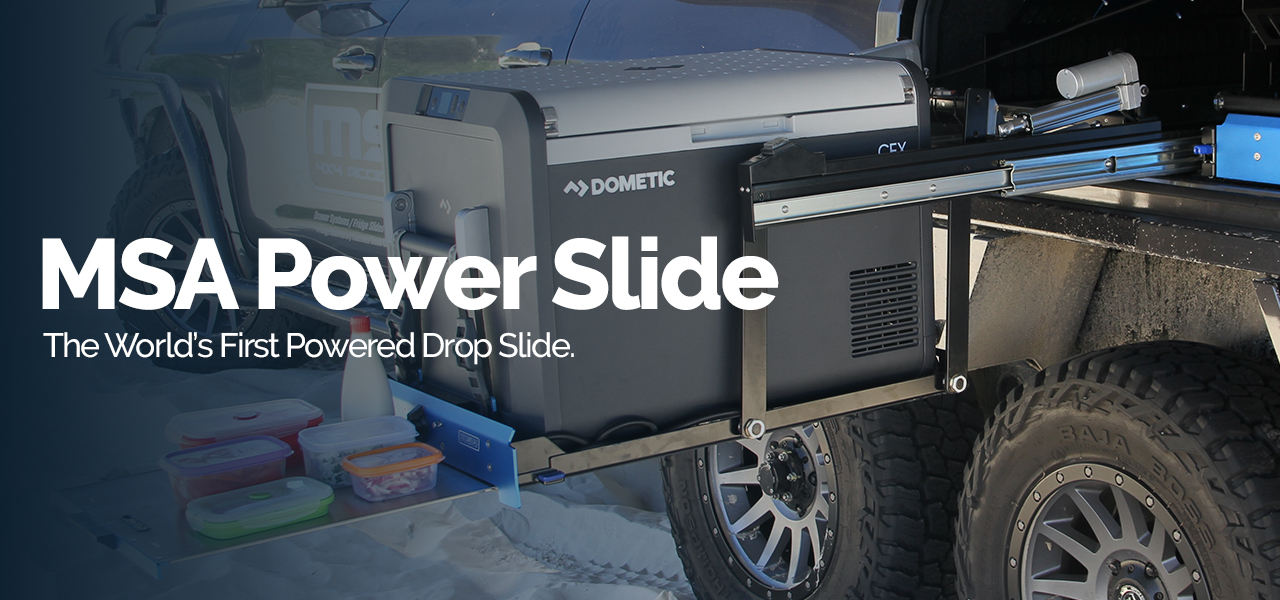 Welcome to the future of stress-free outdoor travel, brought to you by the revolutionary MSA Power Slide™, the world's first powered drop slide. Forget about the hassle of bending over or crouching to access your fridge or freezer.