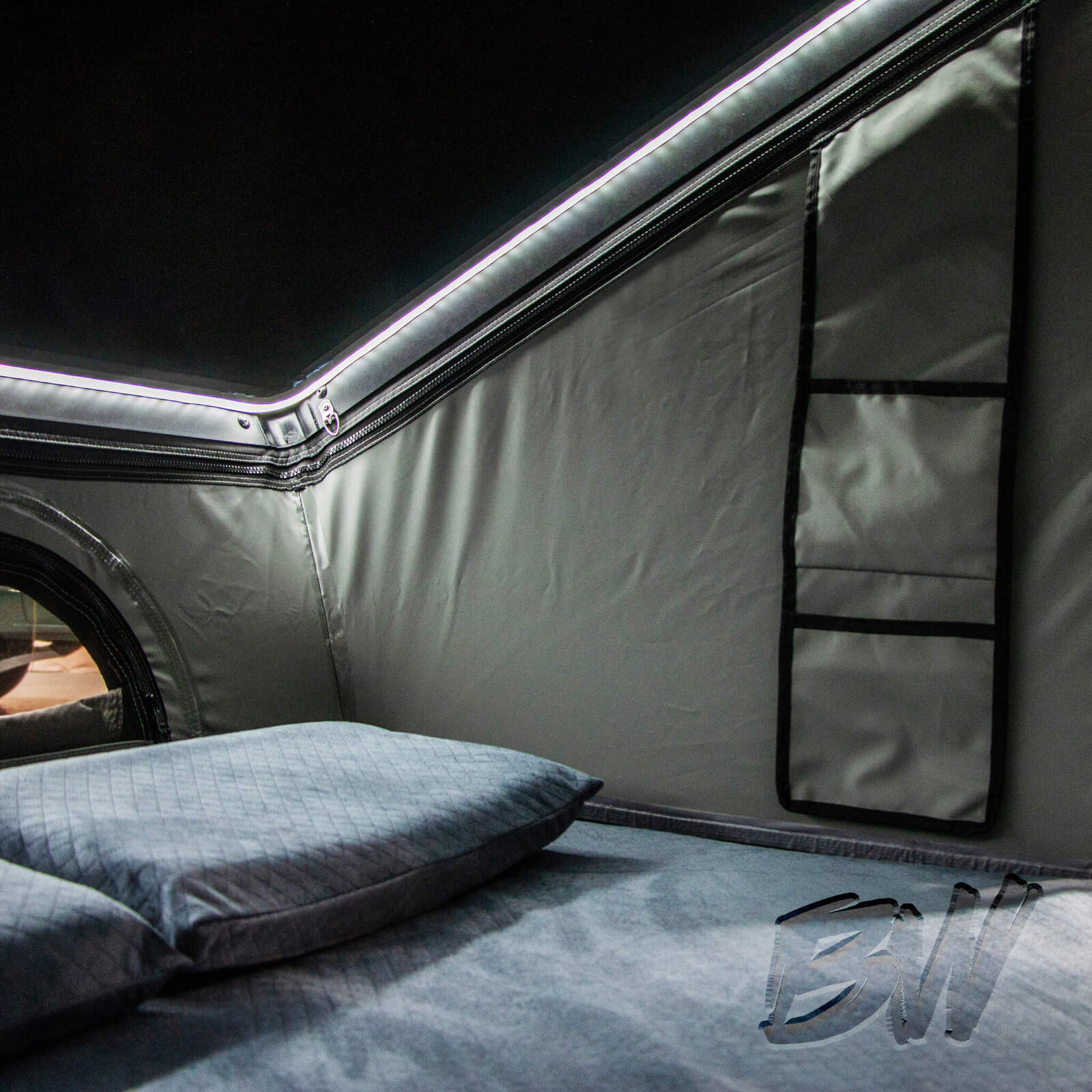 This tent comes loaded with smart features including three cross bars ideal for mounting solar panels or accessories, interior roof-ring lighting with white and amber options, side storage pockets, a shoe storage bag, roof ventilation for improved airflow, a magnetic rechargeable fan, and USB-A & USB-C interior sockets. Two hidden storage compartments in the head unit keep your essentials organized. The included 200W Roam Gear solar panel keeps you powered wherever you roam.