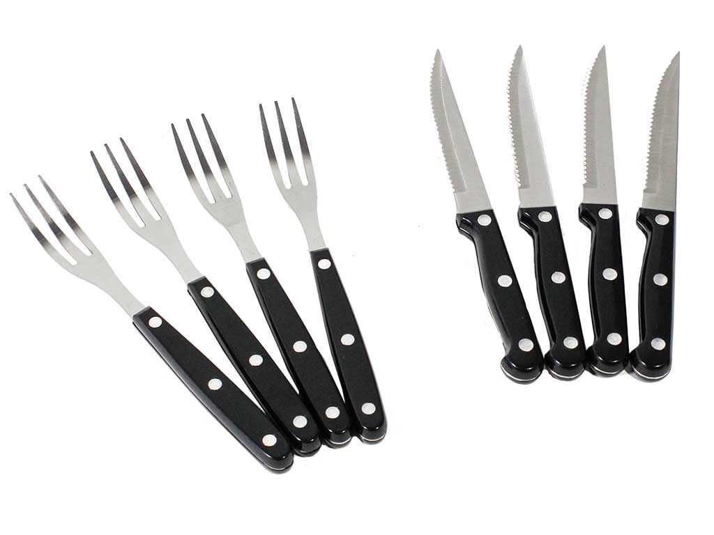 These are not your typical cheap, and easy to break, ''throw away'' camp utensils.The composite handles offer a comfortable and ''weighty'' grip.Triple riveted knife handles with double riveted fork and spoon handles.Professional forged knife blades with black comfort grip poly handles.The steak knives feature high quality, micro-serrated edges.