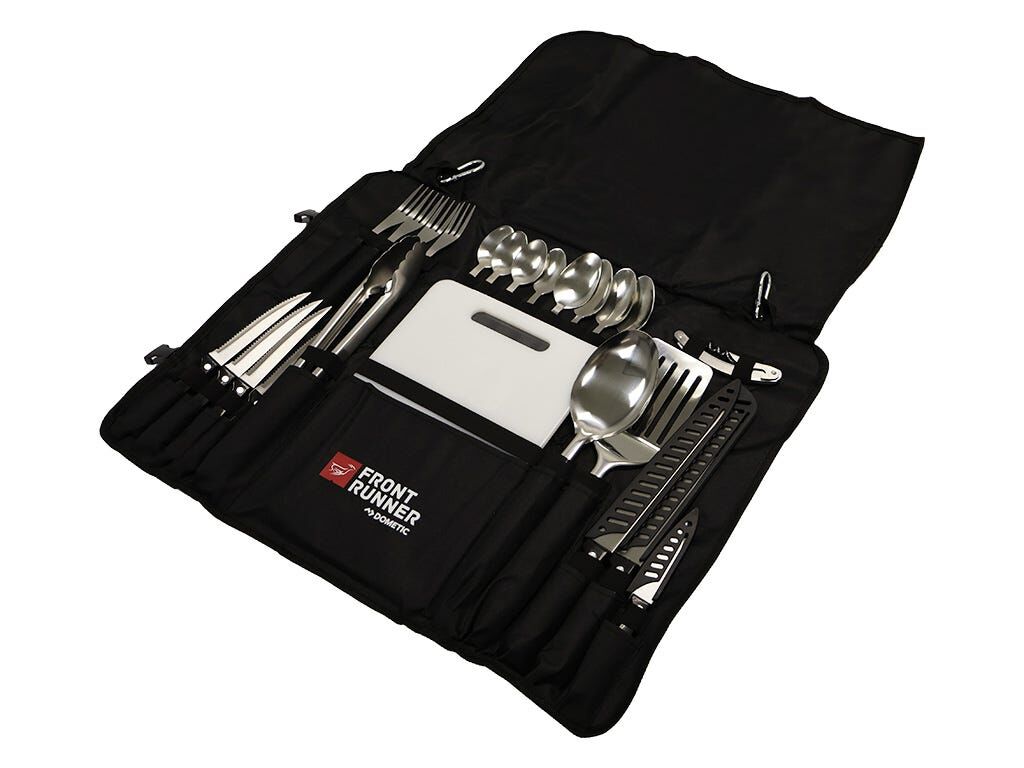 The entire kit fits in a custom tool-style roll with flap, adjustable straps and buckles, and carrying handles. Also features loops with carabiners so the opened roll and utensils can be hung for quick and easy access.