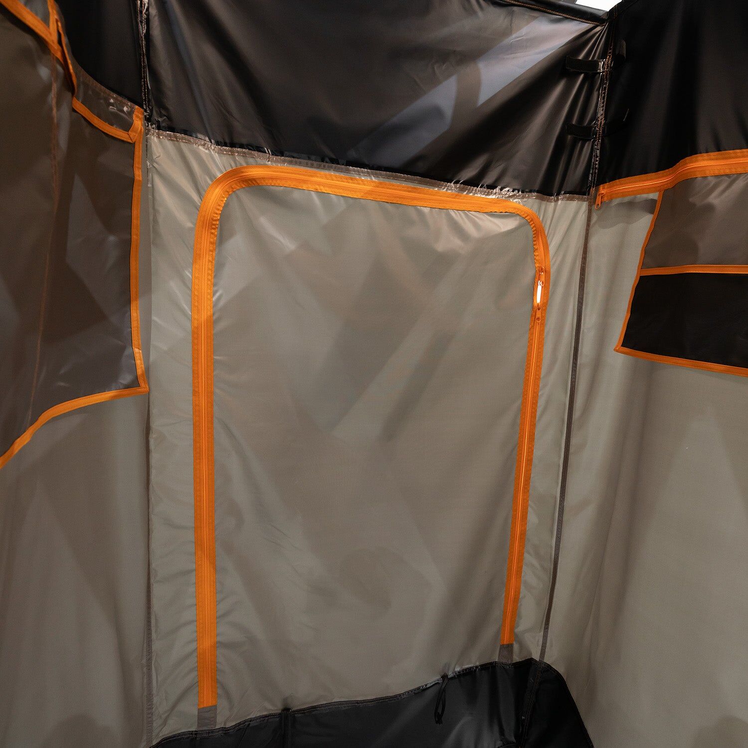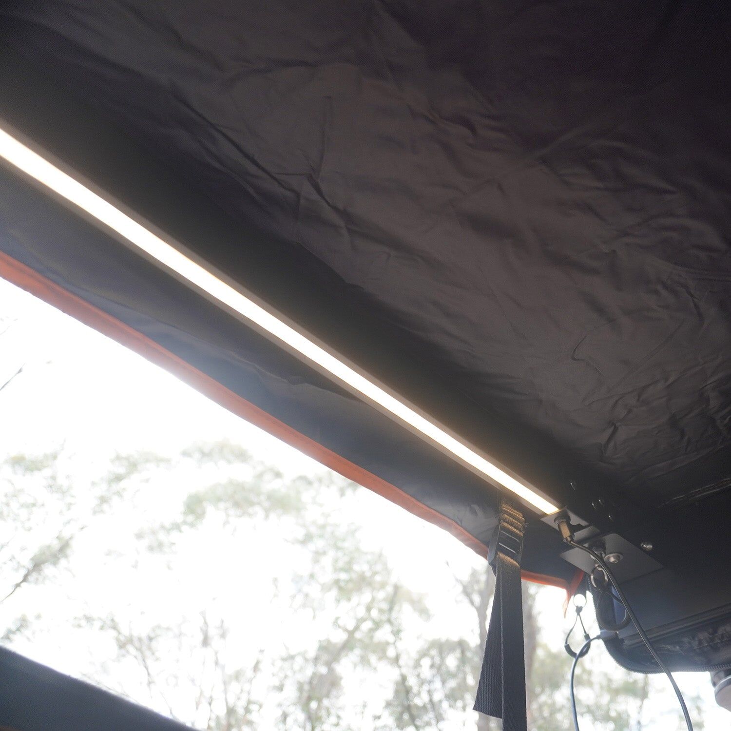Designed for the outdoors, it features a retractable roof so you can let the breeze in or enjoy open-sky views. Built-in dual-coloured LED strips (white & amber) give you the right lighting at any hour, while a large zippered rear door provides quick access to your vehicle. Internal storage pockets keep wet and dry gear separate, so you stay organised and ready for whatever comes next.