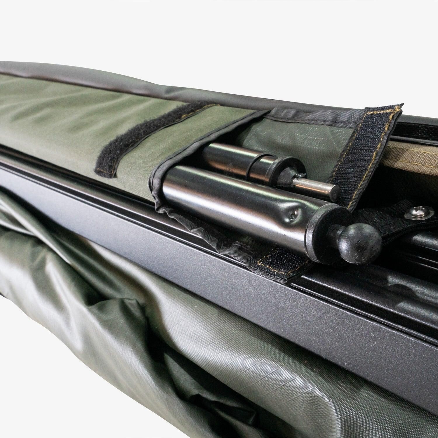 The heavy-duty swivel hinge system holds the entire kit up while you extend and tension the awning arms and release the two pivoting alloy telescopic leg poles stowed along the rafters. Attach the final leg poles and you'll be under cover in a matter of minutes.