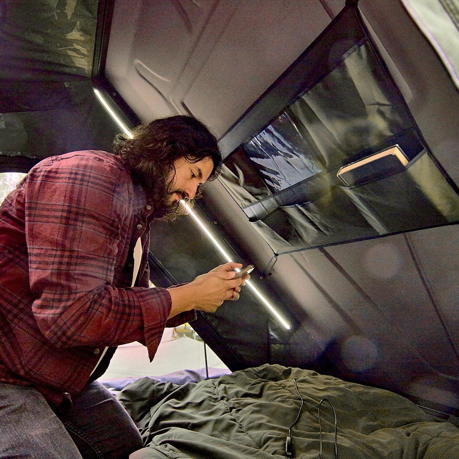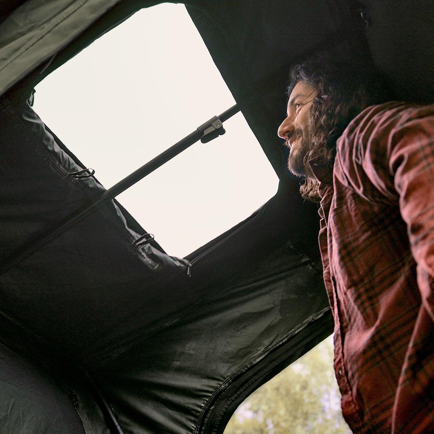 The Ridgeback body tent is made from ecoWGAF - 280gsm Polyester Oxford Ripstop / 100% Recycled RPET fabric. This tent has an impressive 3000mm water rating, high profile automotive rubber weather seals, internal seam sealing and a removable fly that will keep you dry in extended rainy conditions.