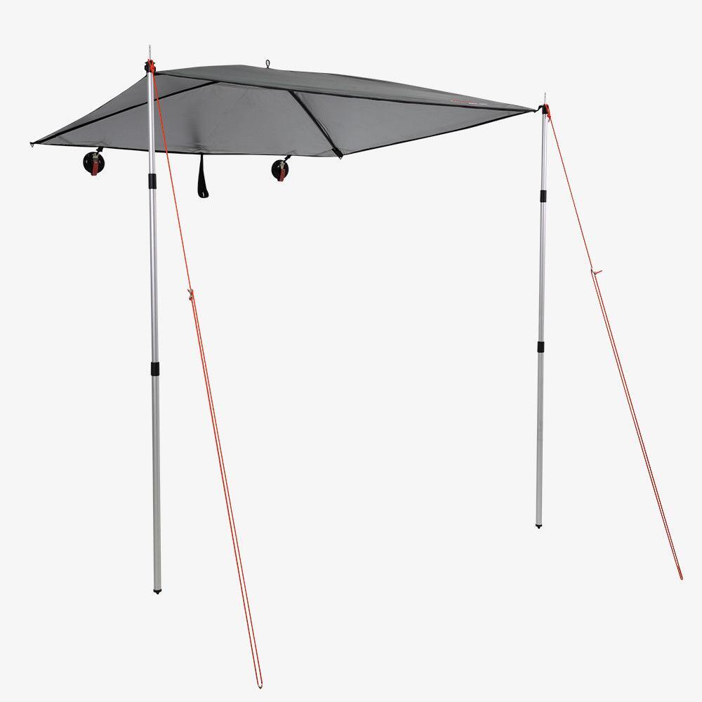 Strong and lightweight, the All-Rounder attaches to vehicles and smooth vertical surfaces via the included suction cups on one end. And strong aluminium telescopic poles on the other. Remove the suction cups and you’ve got a stand-alone shelter for the campsite or beach.