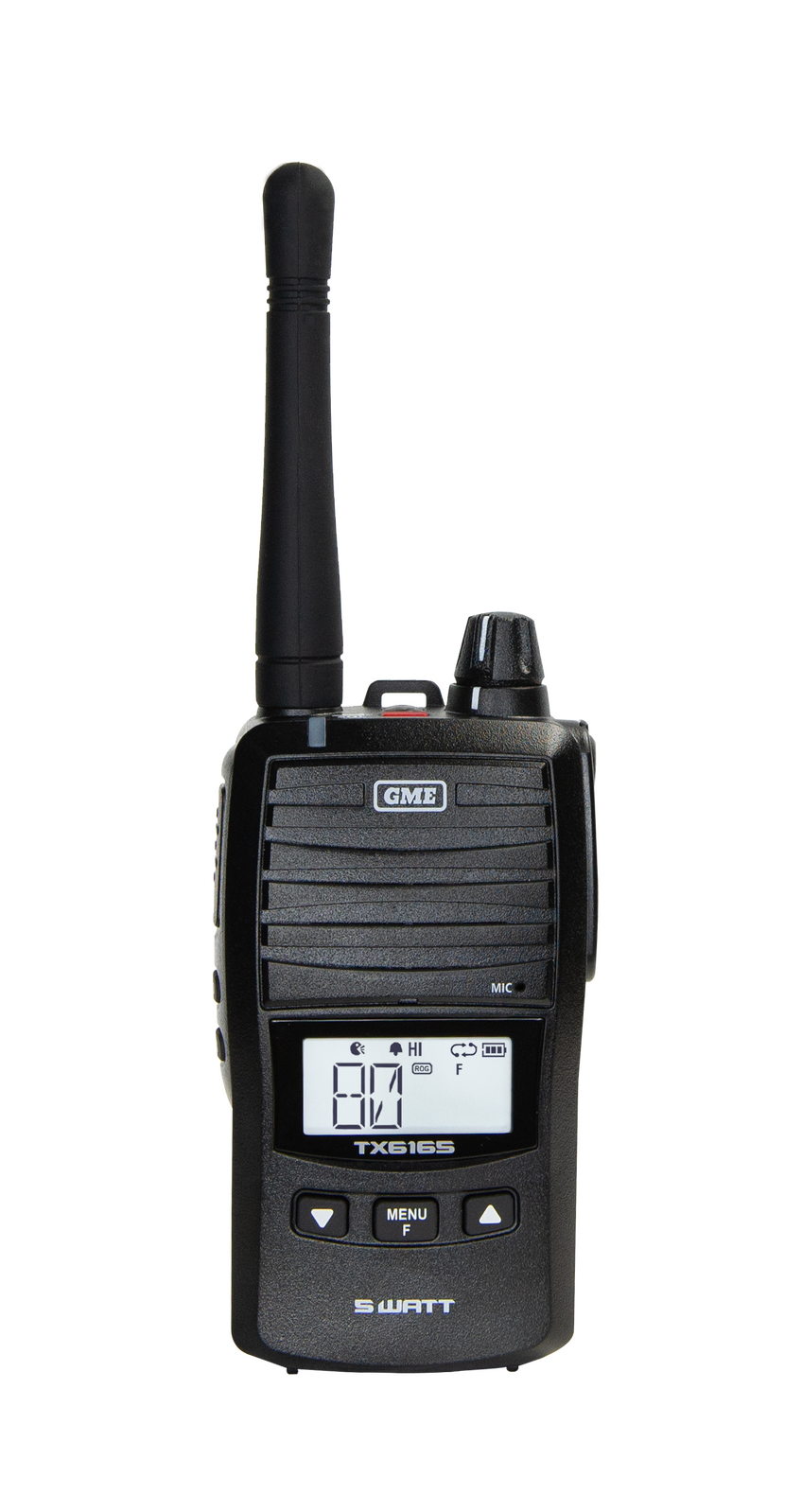 The TX6165 is GME's newest 5 watt Handheld UHF CB radio. New, class-leading features such as the large, high-contrast LCD display, 2 Watt speaker, and a user-programable button make it stand out from the field.
