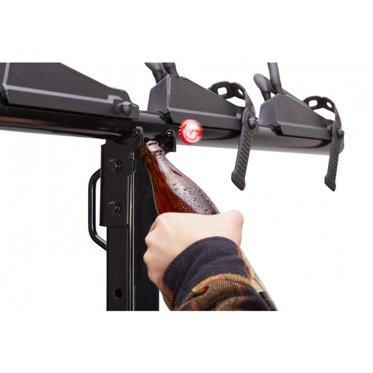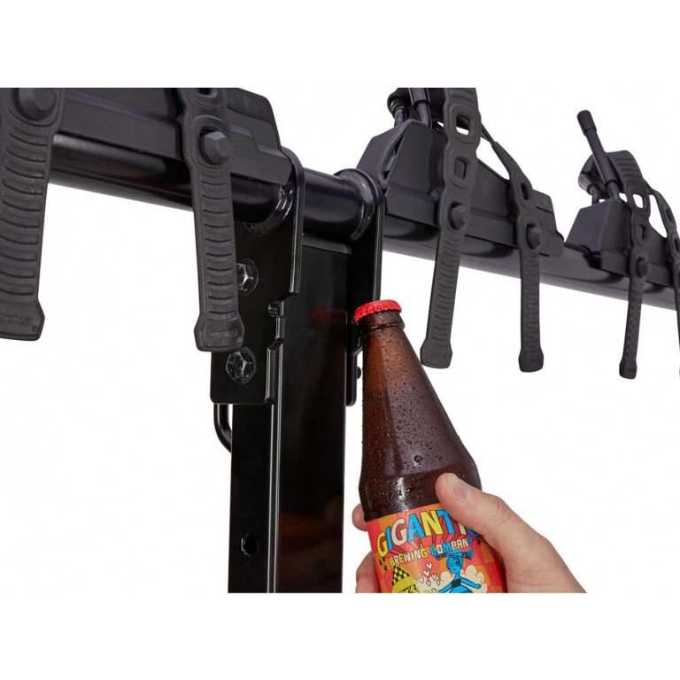 Included with the HangOver 4 is a HitchLock for added security, and it fits 2" hitch receivers, making it compatible with a wide range of vehicles. Plus, it seamlessly integrates with the Yakima BackSwing for even greater accessibility. And with its built-in bottle opener, you can toast to your outdoor adventures with ease. Cheers!