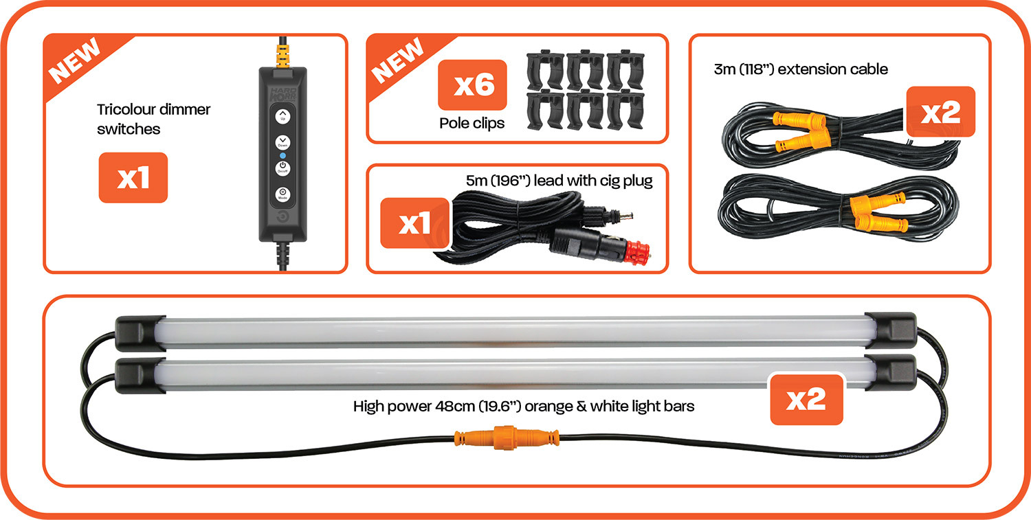 Each bar comes with both orange and white LEDs, and using our exclusive tri-colour dimmer switches, you can create three distinct colours of light – cool white, warm white and orange. The cool white light provides maximum brightness, whereas the new warm white setting gives off a light that is almost as bright as cool white, but with a pleasant soothing warmth. It’s perfect for setting a calm, happy mood in your campsite, particularly later at night. Finally, switching to the orange light naturally reduces the presence of bugs by up to 90%, and is particularly useful around food preparation and eating areas.