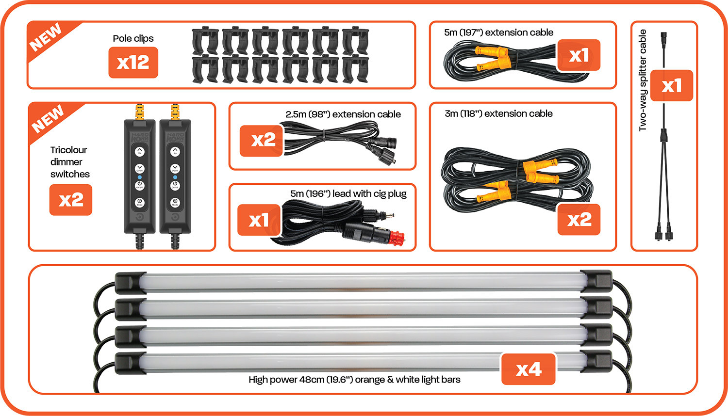 Each bar comes with both orange and white LEDs, and using our exclusive tri-colour dimmer switches, you can create three distinct colours of light – cool white, warm white and orange. The cool white light provides maximum brightness, whereas the new warm white setting gives off a light that is almost as bright as cool white, but with a pleasant soothing warmth. It’s perfect for setting a calm, happy mood in your campsite, particularly later at night. Finally, switching to the orange light naturally reduces the presence of bugs by up to 90%, and is particularly useful around food preparation and eating areas.