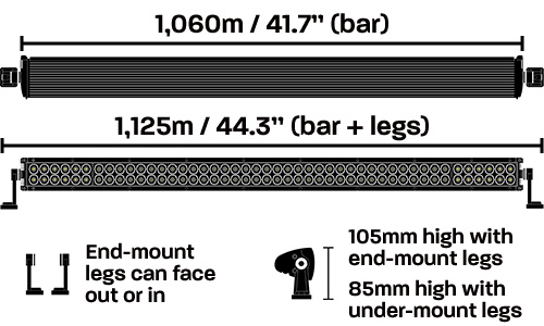 - Dimensions: 1,060mm (w) x 75mm (d) x 85mm (h w/sliding legs) / 105mm (h w/end-mount legs)