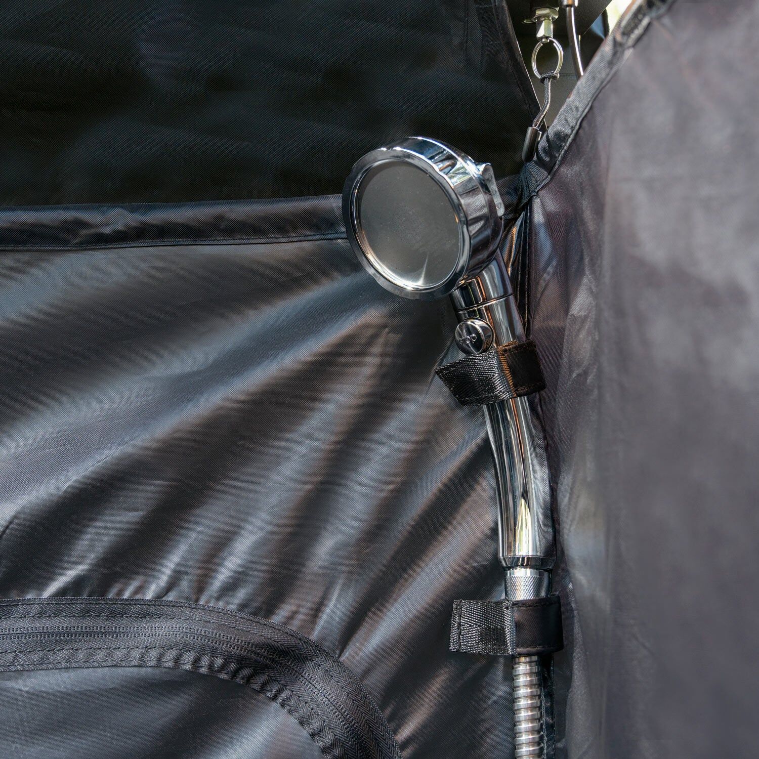 Our handy toiletries storage pouches and shower head mounting loops keep the inside of your shower tidy, organized, and hands-free. Keep your towel and fresh clothes dry inside your car, use the quick access window to retrieve them when you need them.