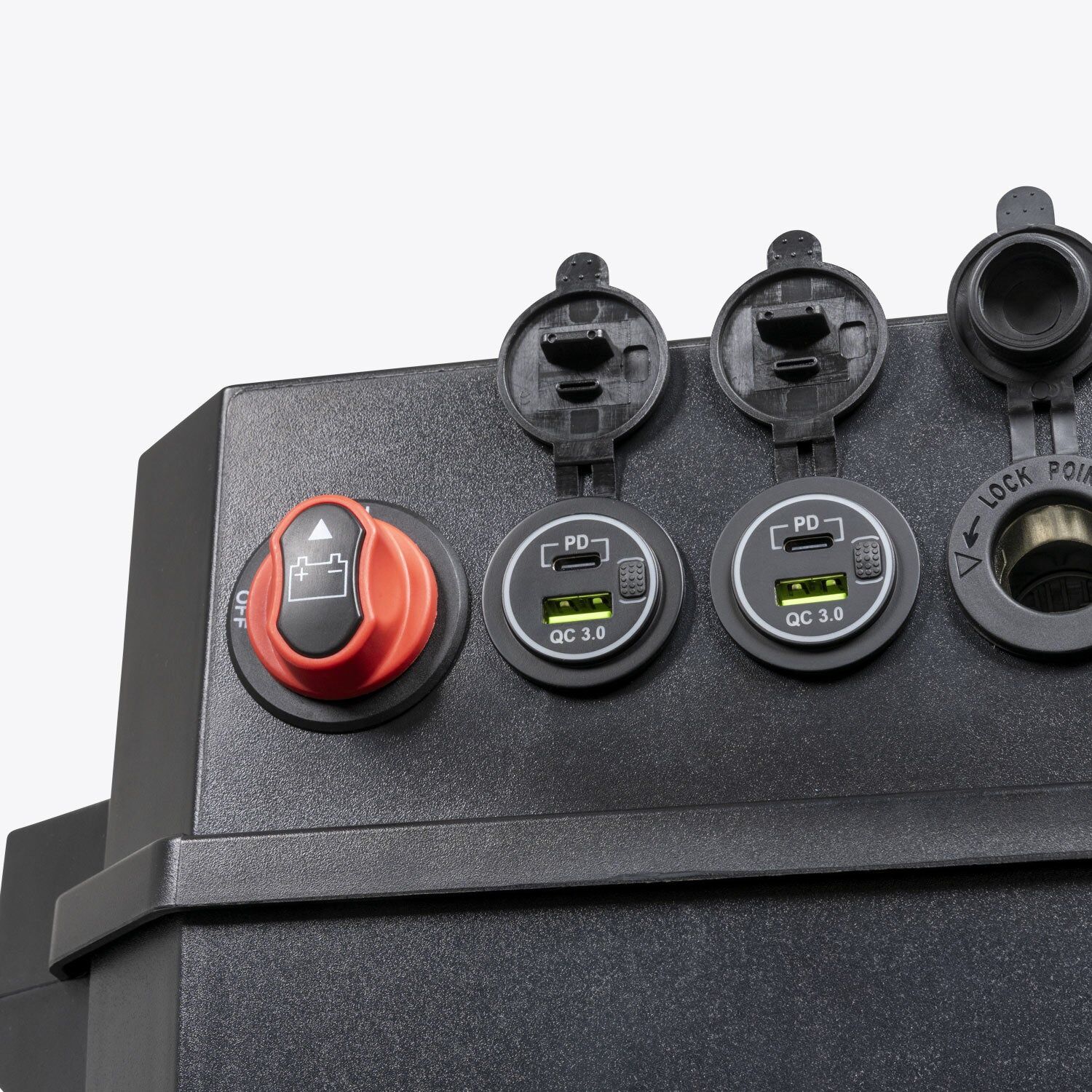 The Heavy Duty Battery Box Pro model gives you more ways to utilise your auxiliary battery power. It comes with an integrated wireless charger, and a wide array of ports, plugs and sockets to give you the power you need, however you need it.