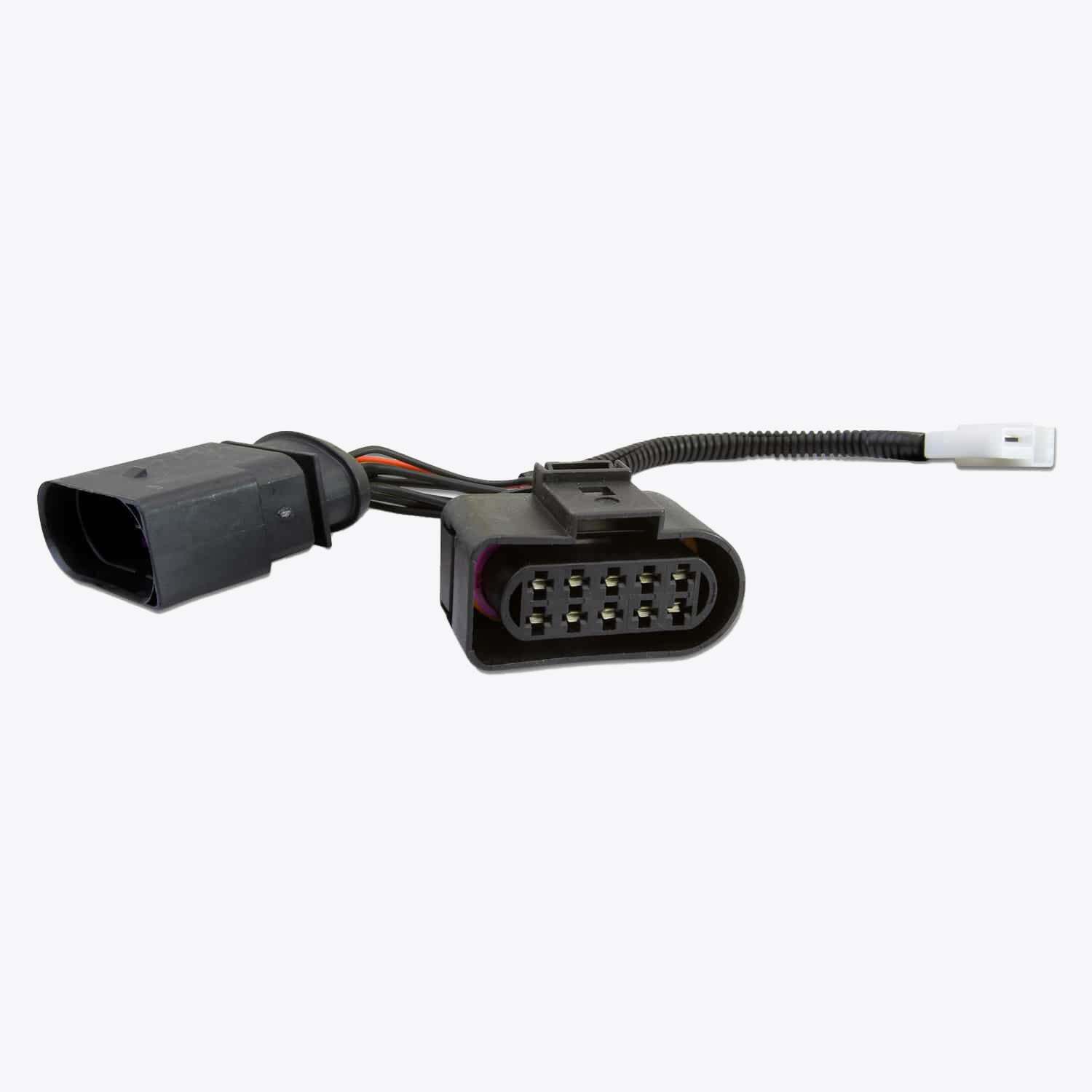 The white T-connector on the back of the adaptor will plug straight into the connector on our wiring harness.