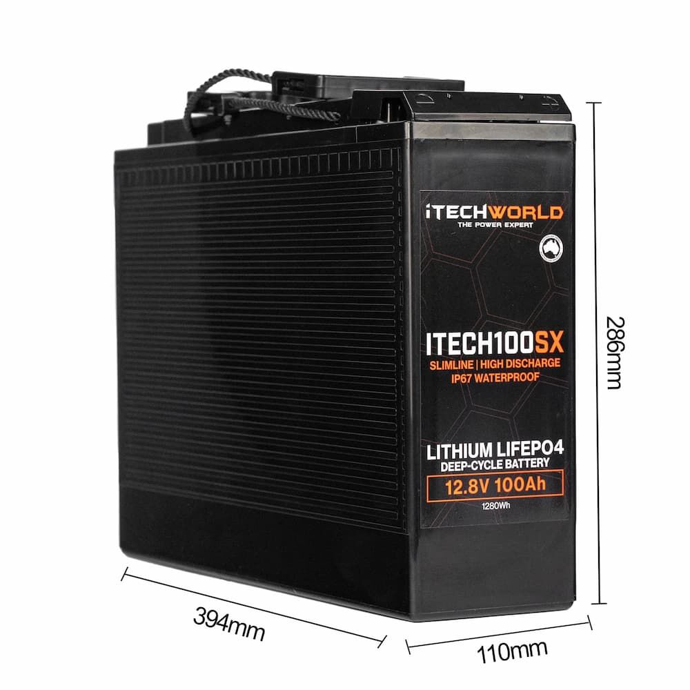 The iTECH100SX 100Ah Slimline Lithium Battery has been designed and developed from the ground up to be the ultimate lithium battery for all canopy setups and Dual/Single Cab utes! Although the iTECH100SX is only 110mm wide and weighs 11.3kg, the iTECH100SX packs a serious punch for a battery of its size.