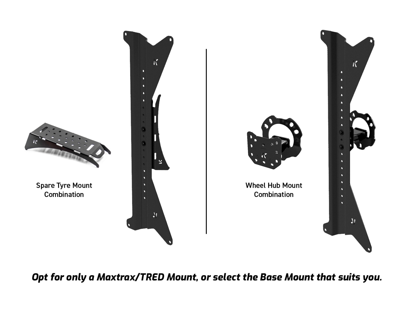 - You can choose from the Spare Tyre Mount, which allows you to still run a rear bin bag or factory reversing camera, or the Wheel Centre Hub Mounting, which bolts directly to the back, or simply purchase the Maxtrax Mount for another DIY use!