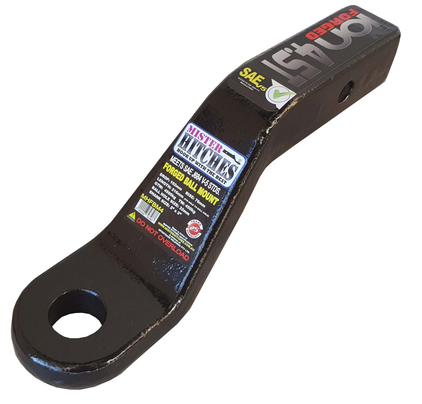 The Mister Hitches 4.5T Ion Forged Ball Mount with a 4" drop or 3" rise is a heavy-duty towing accessory designed for durability and versatility.