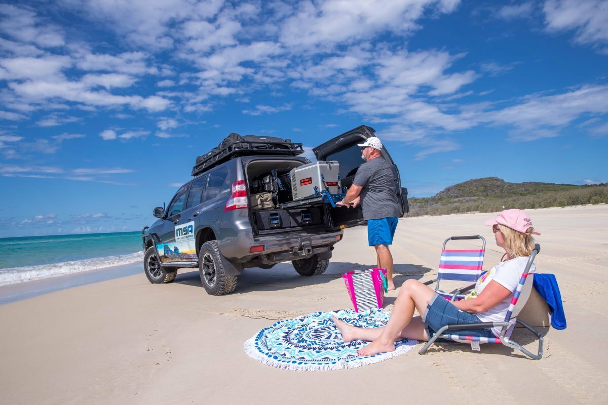 Perfect for preparing a quick meal for the family when on the road. The Drop Slide lowers 30 centimetres while extending over the tailgate of the vehicle, allowing easy access to a fridge, toolbox or generator.
