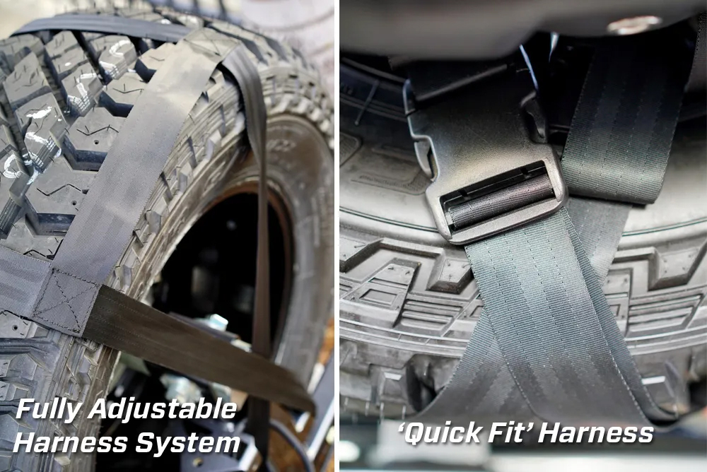 Guaranteed to withstand all that the Australian environment can throw at it and will not stiffen or crack in the cold and is machine washable. The strong, quick-fit 50mm harness system, that can be installed and removed in as little as 30 seconds, will fit any size car, caravan or camper spare tyre.