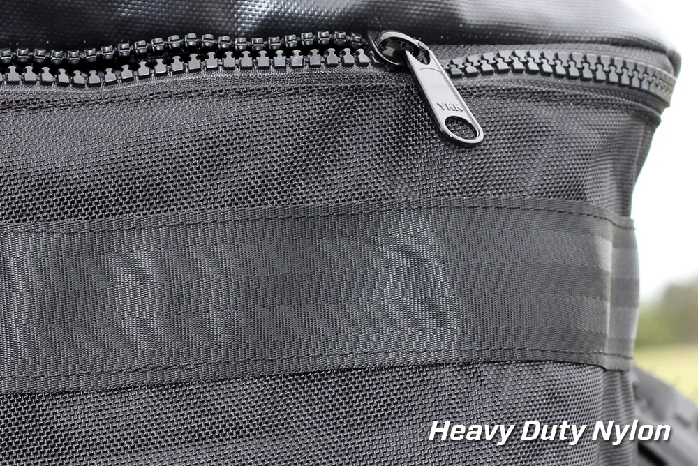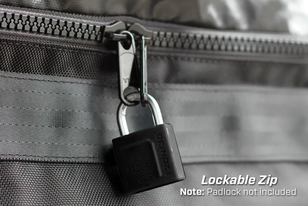 Can be padlocked onto the wheel with a lock strap and together with the YKK Chunky zip with 2 x lockable metal sliders, create an extra level of security. The triple, reinforced base ensures stored gear remains secure and packed away while travelling on rough roads.
