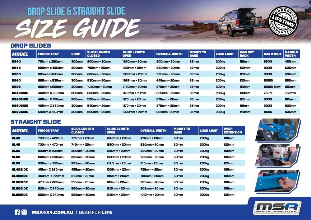The MSA Straight Slides are designed to suit vehicle rear set ups already at a low height. The slide extends smoothly out past your vehicle's tailgate or rear bar, remaining in a horizontal position. Its flat mounting base assists in allowing for a quick and easy installation.