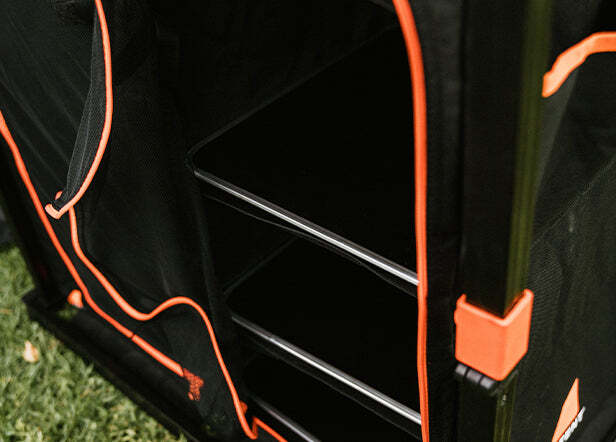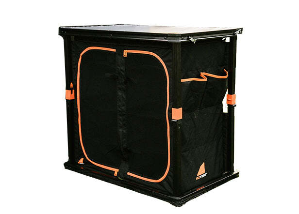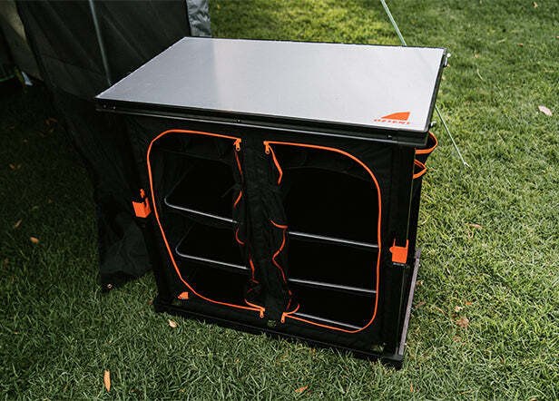The OZTENT Double Camper Cupboard! Building on the ever popular OZTENT Camper Cupboard the Double Camper Cupboard features easy setup and pack down, 2 storage areas with 3 shelves each, extra large side pockets, a laminated aluminium resin bench top and it all packs down to a flat pack size which is perfect for your next camping adventure.
