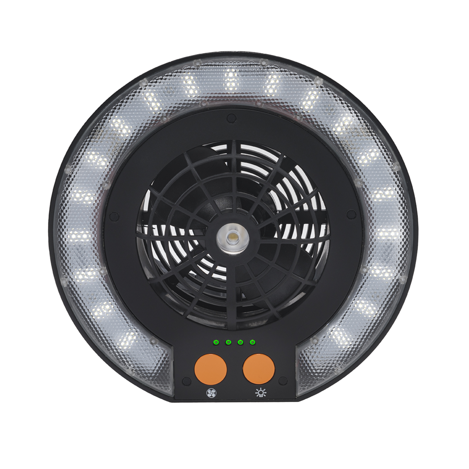 The OZTENT LED Fan Light is a 3-speed fan with multiple lighting functions and USB charge port. Light settings are - spotlight, ring-light lamp and mosquito repellent. Its lightweight design makes it easy to carry, hang or stand. Perfect for keeping your shelter cool and condensation low.