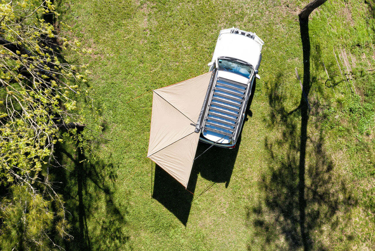 Made from waterproof, fire-retardant and UPF50+ certified Ripstop polyester, the Foxwing 180° Awning is designed to protect you from the elements. Removing the hassle from packing up, each arm folds away smoothly into a sleek rooftop mount, which doubles as a storage bag for your poles, pegs and ropes.