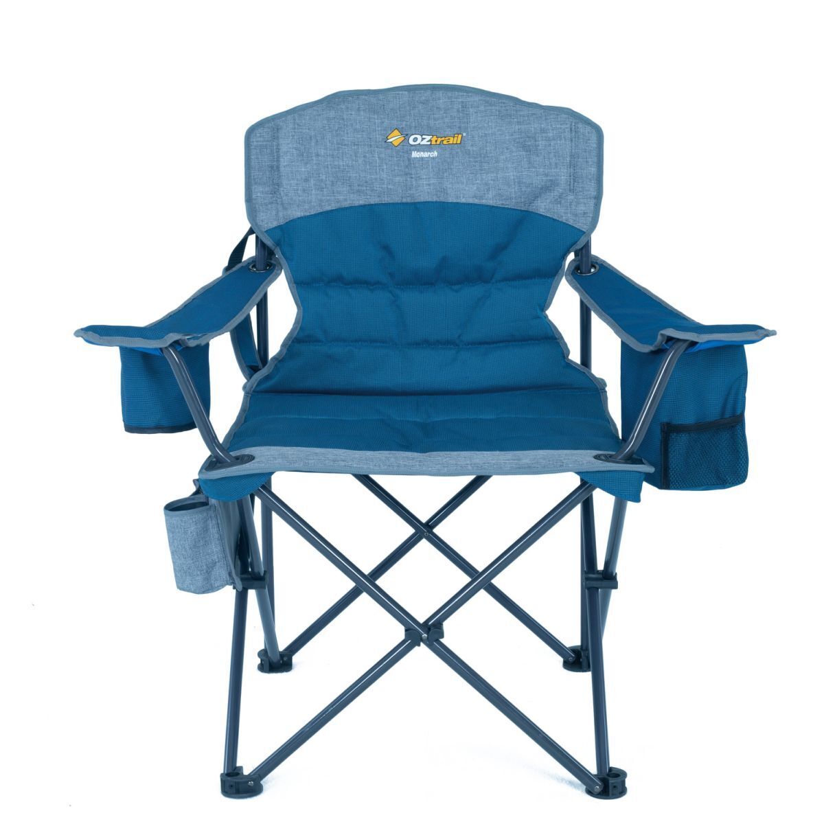 The Oztrail Monarch Chair offers a premium blend of comfort, durability, and functionality, making it a must-have for outdoor enthusiasts. Built with a high-tensile steel frame, this chair boasts strength and stability, while its fully padded seat and backrest, crafted from tough 600D Polyester, ensure maximum comfort on all your outings. Designed for convenience, it includes a large drink holder, a wine glass holder, an in-arm cooler compartment to keep beverages chilled, and a deluxe side organizer for storing essentials. Whether you're camping, enjoying a beach day, or watching a sports event, the Monarch Chair combines comfort and practicality for all your outdoor adventures.