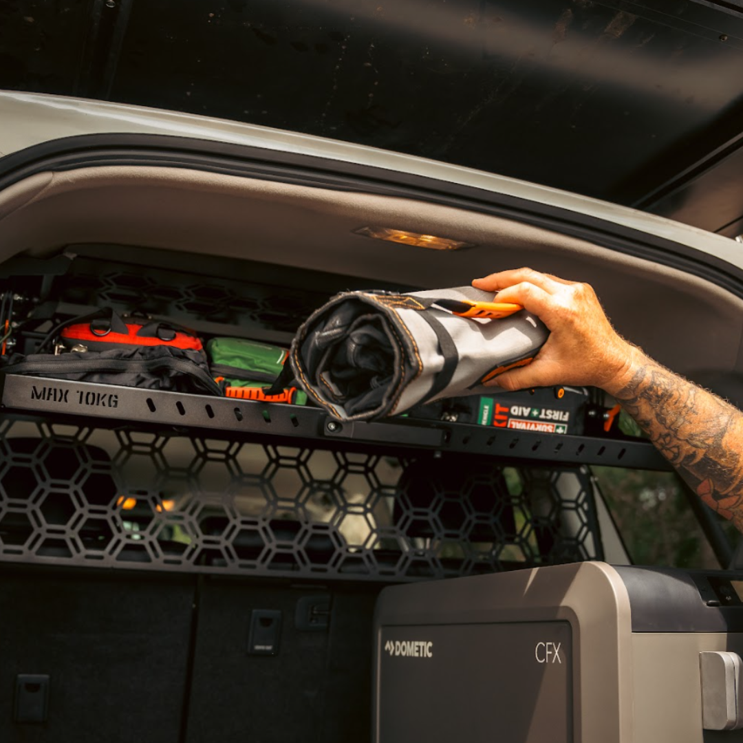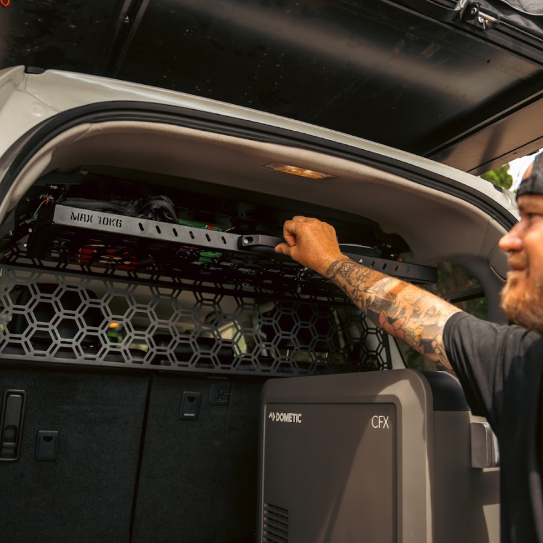 Built from tough, lightweight materials, the shelf effortlessly drops down to give you a clear view and easy reach into the rear space—perfect for loading up camping gear, tools, recovery equipment, or everyday essentials.