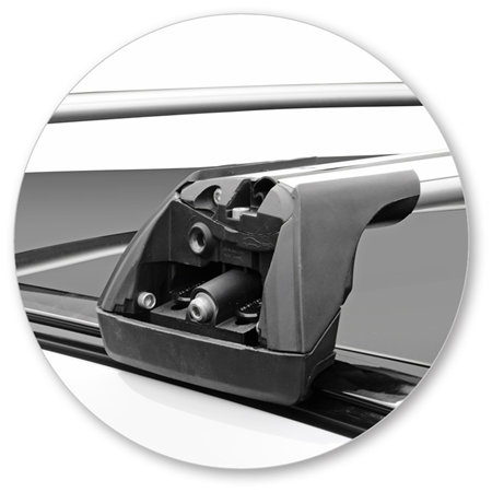 Clamps onto flush roof rail. Pins locate on inside of rail