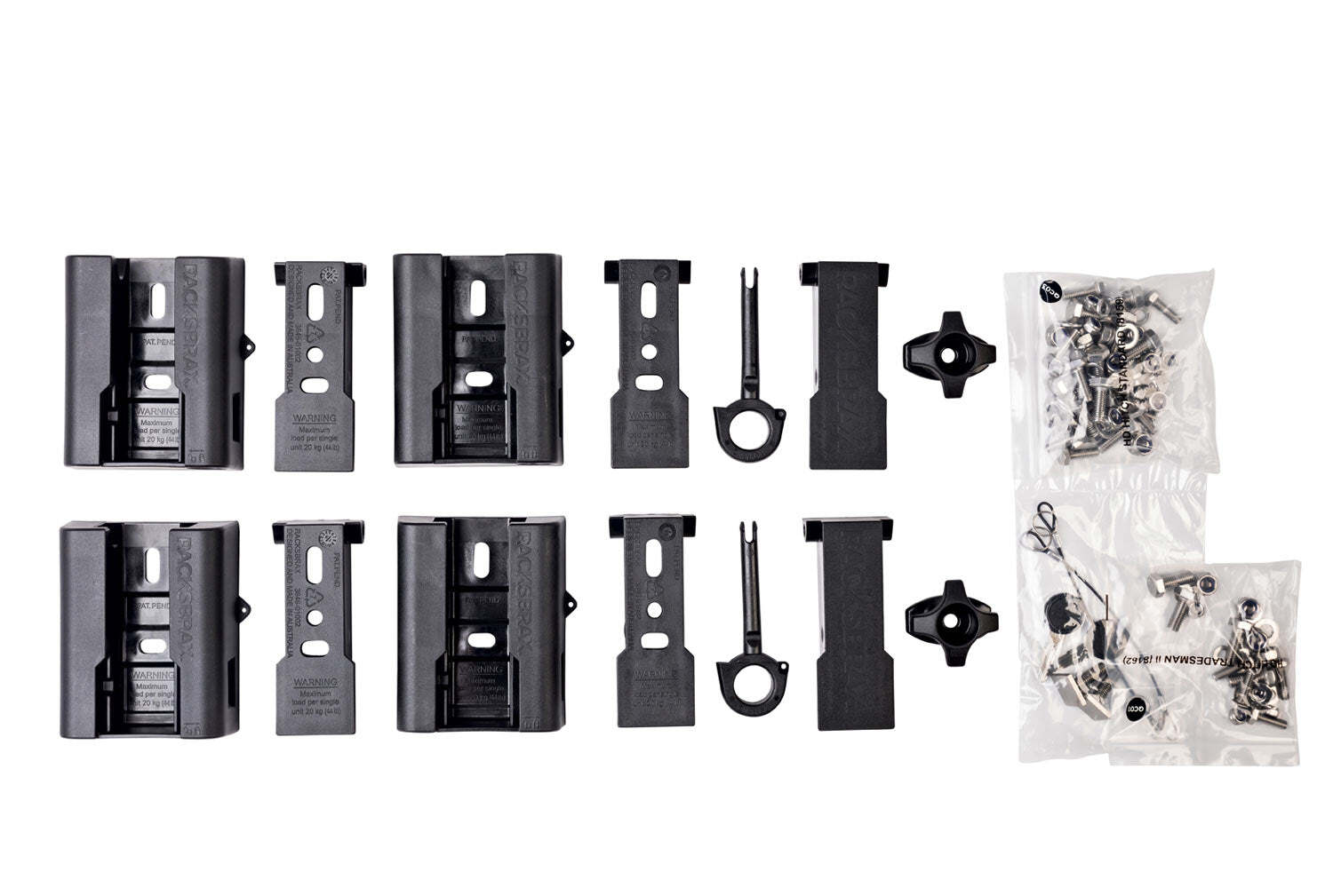 The RacksBrax HD Hitch Tradesman II Pack includes a set of glass reinforced nylon brackets with stainless steel fasteners to lock-on and take off roof rack accessories including pull-out awnings, ensuite tents and conduit tubes.  This pack also includes a set of RacksBrax HD Wall Mounts so that the roof rack accessory can be fixed to a garage wall when not in use.
