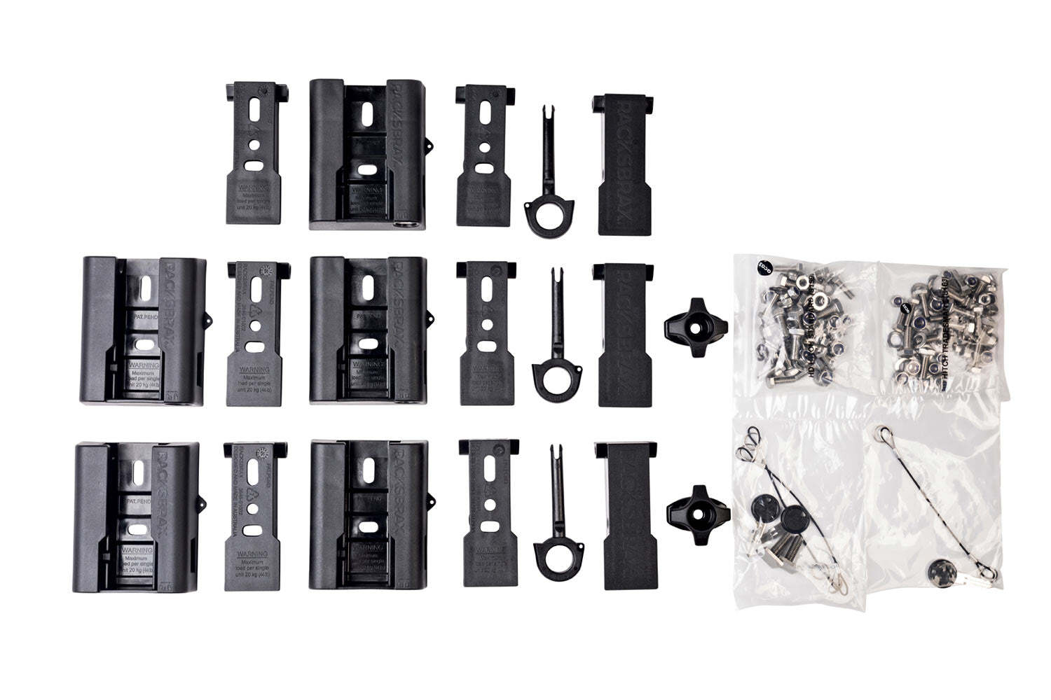 The RacksBrax HD Hitch Tradesman III Pack includes a set of three glass reinforced nylon brackets with stainless steel fasteners to lock-on and take off extra heavy roof rack accessories including pull-out awnings, ensuite tents and conduit tubes.  This pack also includes a set of two RacksBrax HD Wall Mounts so that the roof rack accessory can be fixed to a garage wall when not in use.