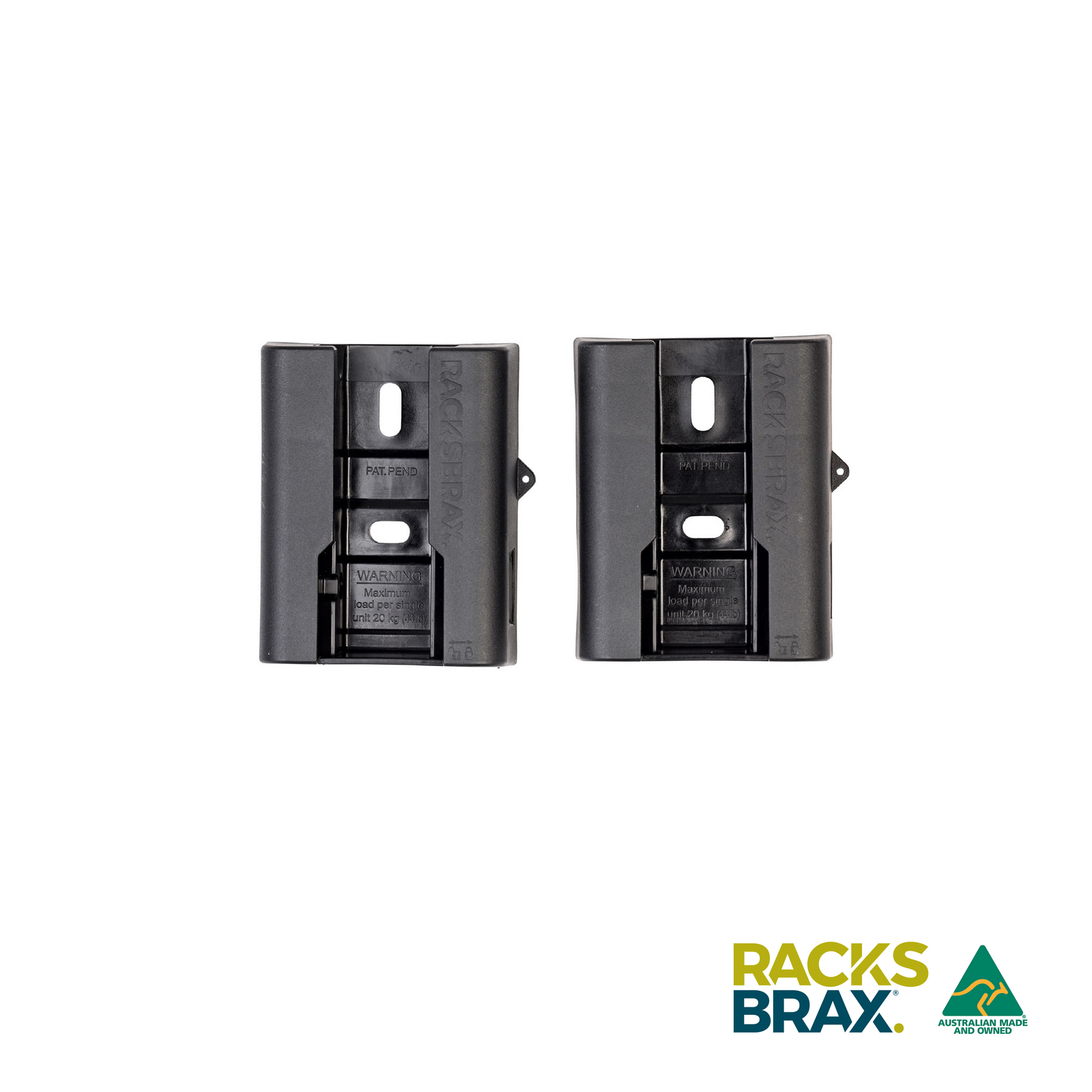 This pack includes one pair of quick release Bodies so that your roof rack accessory can be fixed to a garage wall when not in use. This allows for easy changeover from awning to conduit tube and back to awning … each in less than 10 seconds.