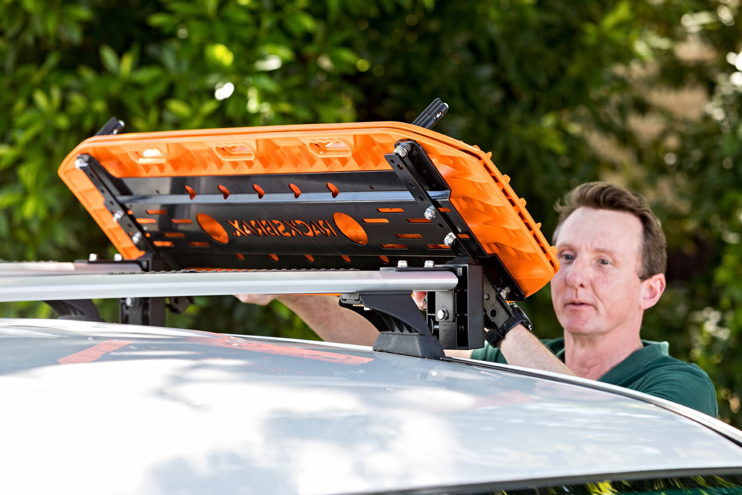 The HD Accessory Bars (8173) with a RacksBrax HD Hitch (Sold Separately) allows you to lock on or take off a full sized MAXTRAX and TRED Recovery Board. Take your recovery boards off your roof rack in less than 10 seconds.