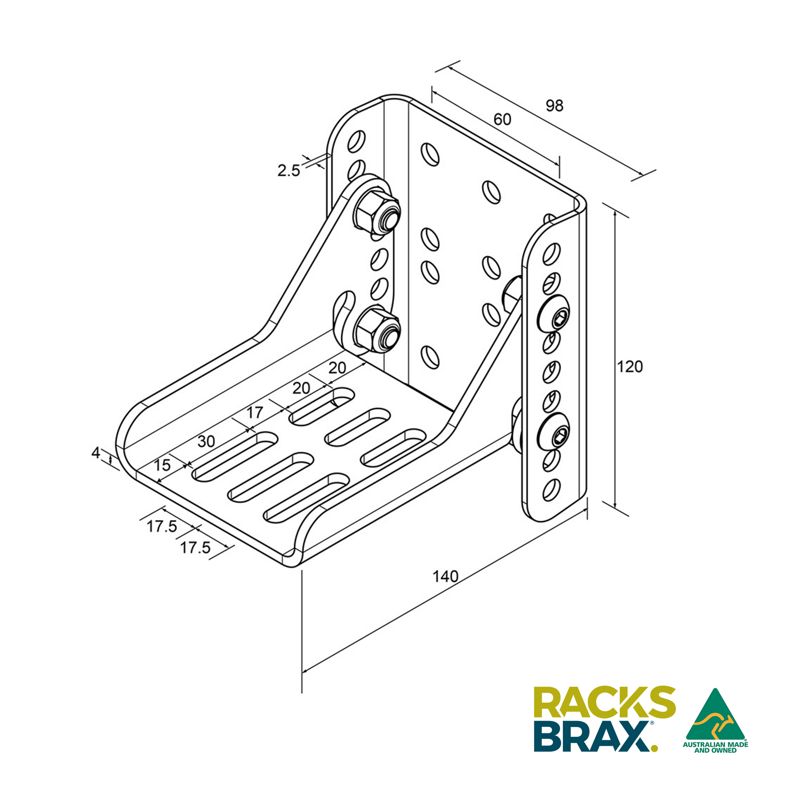 The RacksBrax HD Adjustable Brackets have been specifically designed for the upright portion to fit the RacksBrax HD Hitch although may be used without an HD Hitch to fit accessories where mount points are at 50mm centres.
