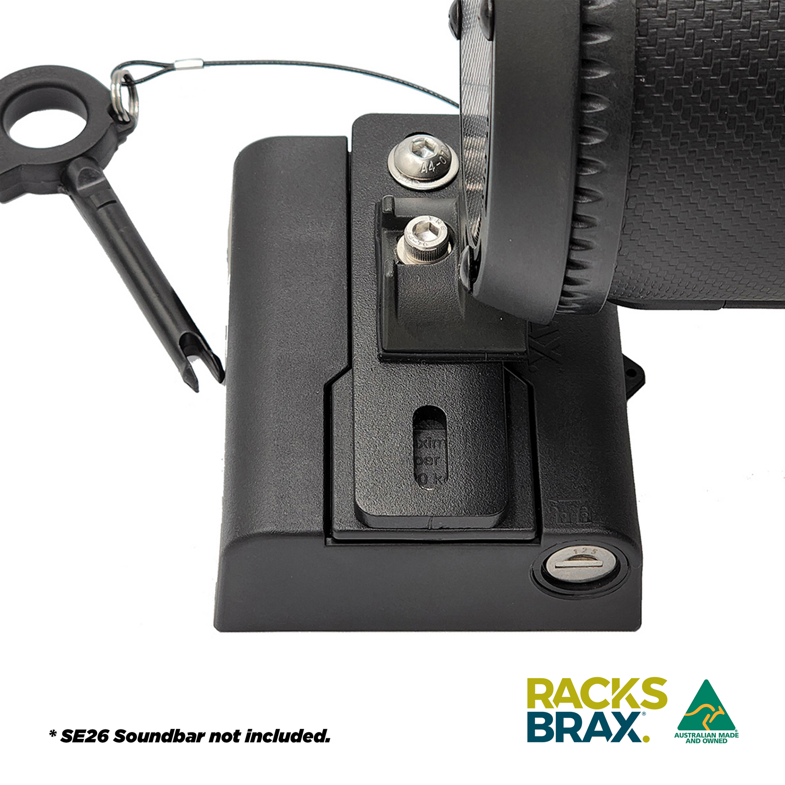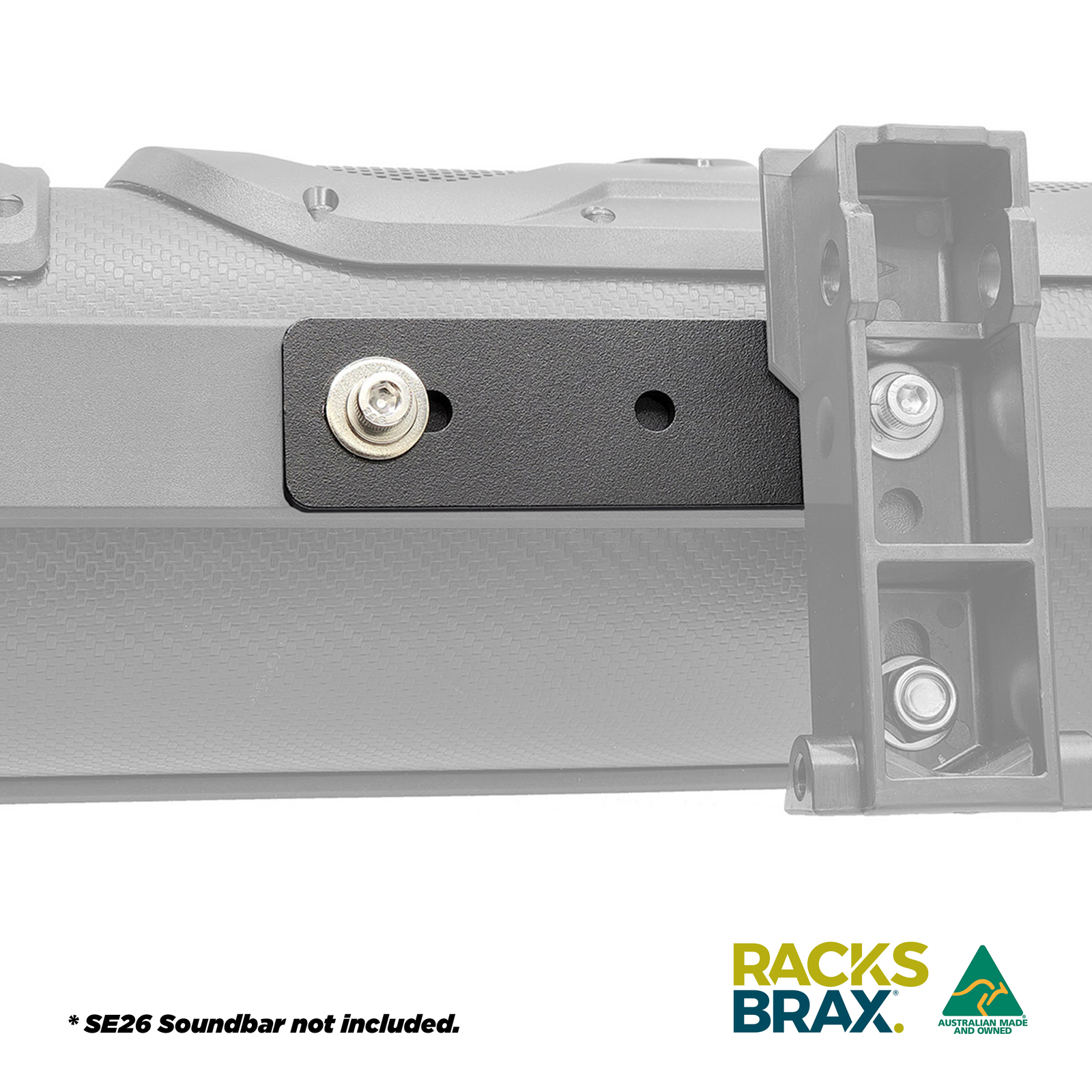 By using the supplied Soundbar Adaptor, the Soundbar fastens to the quick release RacksBrax HD Hitch. The Soundbar can either fasten via its feet or via the solid metal spine on the rear of the Soundbar.