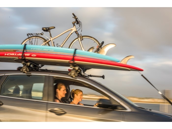 A stand up paddleboard mount which can hold up to two SUP Boards up to 92 cm wide. The SupDawg is fully assembled out-of-the-box, features integrated rollers for easy loading and includes SKS locks.