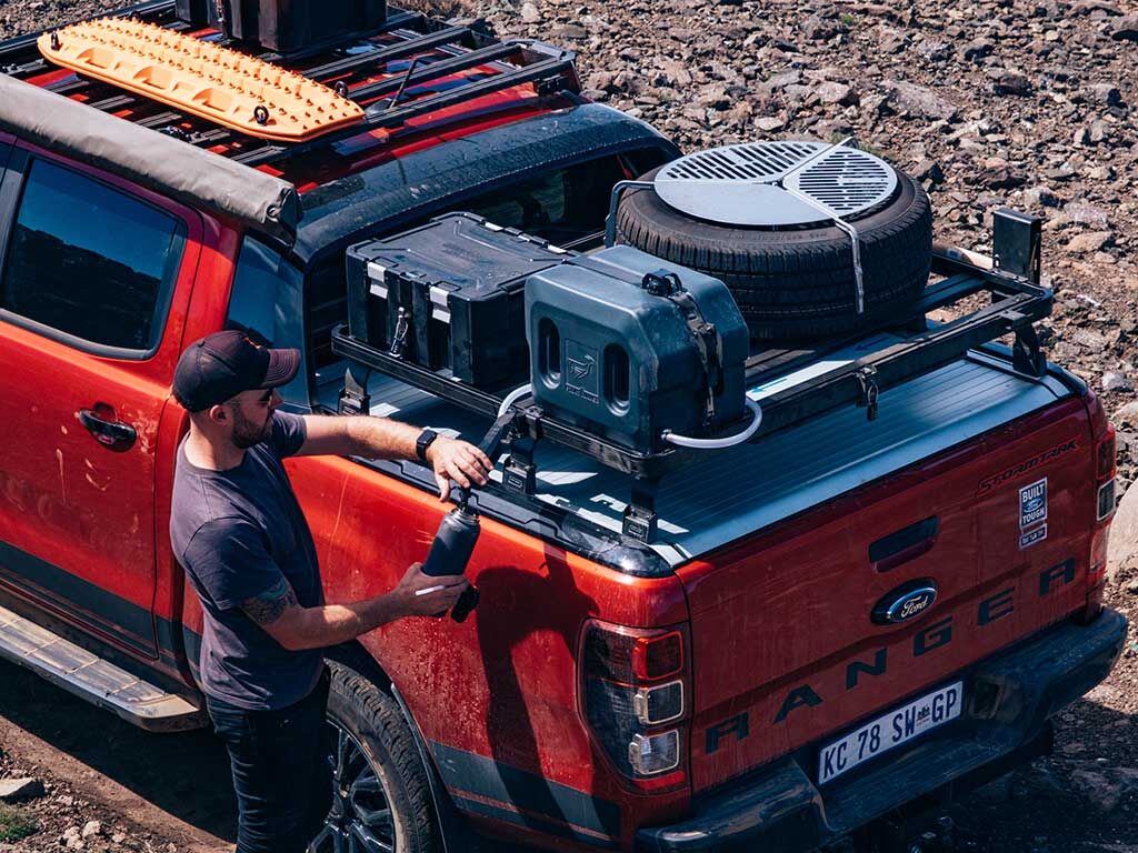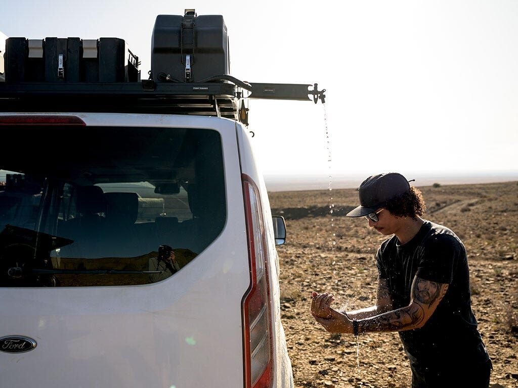 Swings out 90 degrees from the side of the rack, allowing your water tap to clear the side of your vehicle.