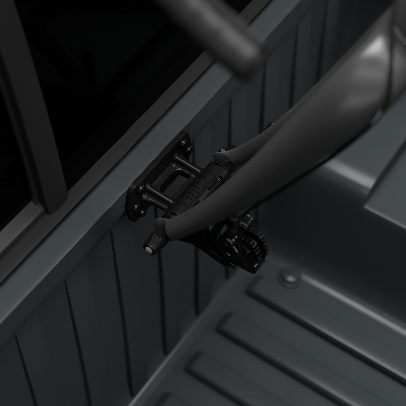 • Capacity to transport bikes with 9mm quick release forks and thru axle diameters 12x100, 12x110, 15x100, 15x110 via existing 9mm skewer and new thru axle adapters