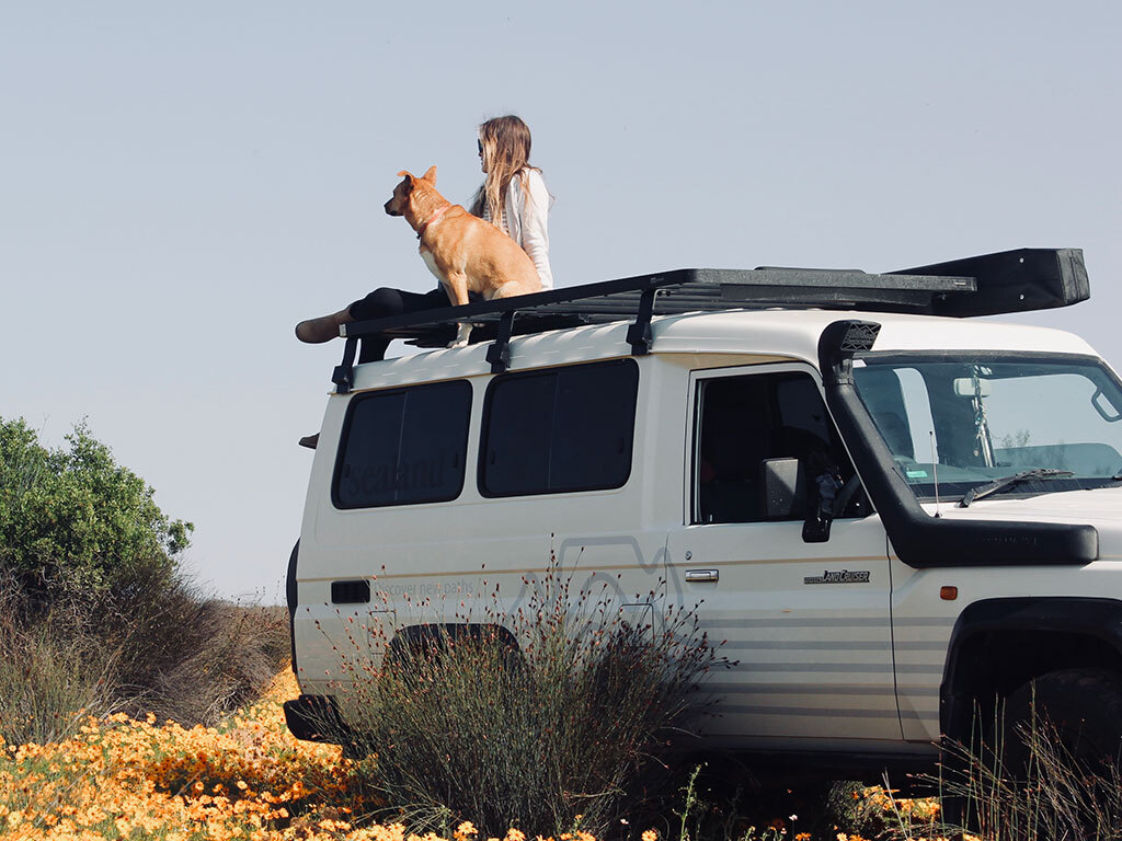This 1964mm/77.3” long, 3/4 size, Slimline II cargo carrying roof rack kit for the 78 series Toyota Land Cruiser contains Slimline II Tray and Wind Deflector, as well as 8 Gutter Mount Legs for mounting the Tray to the vehicle. This taller kit has space for mounting the Front Runner tables or other compatible accessories under the rack. Installs easily with no drilling required.