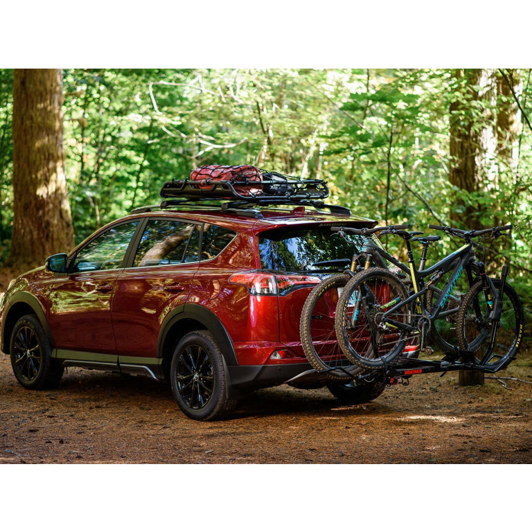 - Hitch mounted tray rack that loads quickly and carries two bikes without frame contact